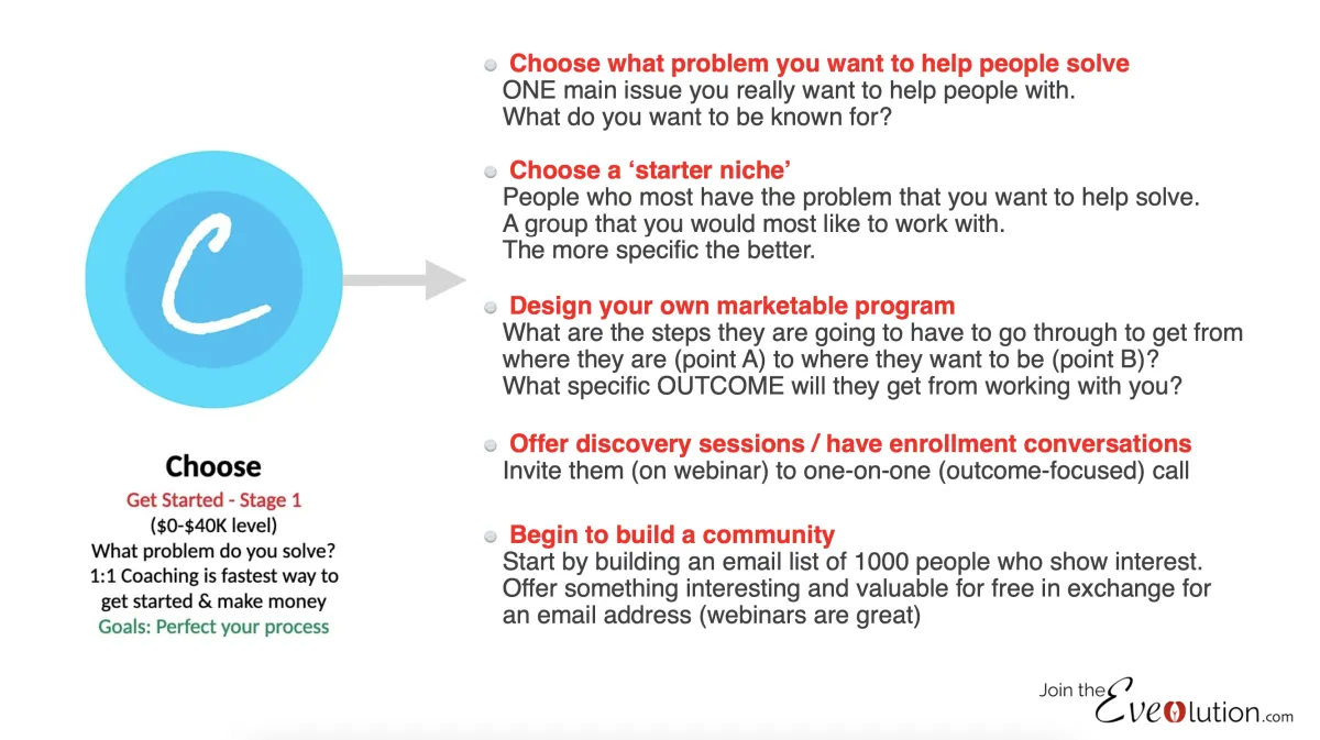 Until you’ve chosen your position, your promise, and your person, moving forward will only multiply confusion. The key focus at this stage is alignment and definition. You must focus on defining your niche and ideal client, identifying the core problem you solve, and articulating the transformation you help clients achieve. You’ll also need to clarify your message... what you stand for, what your story is, and what makes your coaching approach unique. These elements form your “magnetic field,” attracting the right clients.